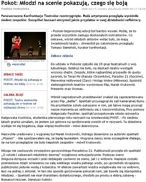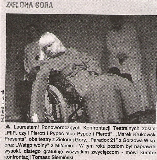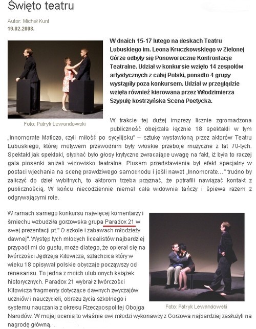 Uk??ony dla publiczno??ci, uk??ony dla Paradoxu 21, kt??ry nie tylko istnieje, nie tylko si? bawi, ale te?? okaza?? si? czarnym koniem drugiej edycji Ponoworocznych Konfrontacji Teatralnych w Zielonej G??rze. Zostali??my laureatem i cieszy nas to podw??jnie, a nawet potr??jnie - po pierwsze by?? to nasz debiut na scenie teatru nazwijmy to doros??ego (dla m??odzie??y od 16 lat w g??r?), po drugie zagrali??my naprawd? ??wietnie i chocia?? byli??my chyba najm??odsi, stan?li??my do r??wnej rywalizacji z zespo??ami, kt??re s? ju?? wyjadaczami amatorskiej sceny teatralnej i wielokrotnie w Zielonej G??rze wyst?powa??y, po trzecie po???czyli??my sukces ze ??wietn? zabaw?. Wielki szacunek dla ludzi, kt??rzy stworzyli razem kawa??ek energetycznego teatru, bo chocia?? nasi aktorzy rozeszli si? po r????nych szko??ach i maj? nowe obowi?zki, to udowodnili prawd?, ??e "chcie? to m??c".