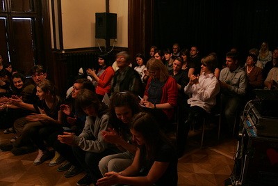 Widownia teatralna. W??r??d juror??w aktorka teatru gorzowskiego B. Pomyka??a i gorzowski poeta I. K. Szmidt. Spotkania zorganizowa?? Grodzki Dom Kultury w Gorzowie, a ca??o??Ä? prowadzi?? Konrad Stala, kt??rego teatr "Prawie profesjonalni" zresztÄ? zwyciÄ???y?? tegorocznÄ? edycjÄ? Spotka??.