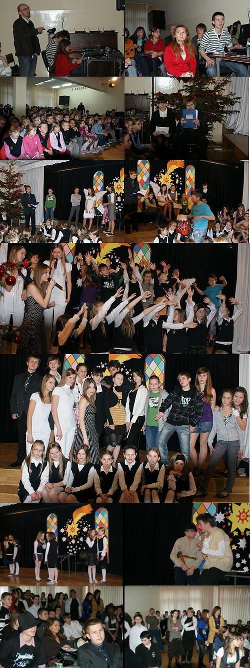 A oto mix zdjÄ?Ä? z naszych przedstawie?? dla uczni??w naszej szko??y. W przedstawieniu udzia?? wziÄ?li: Sara Strajbel i Kamila Szatkowska z 6c, Maciej Niklas z Ia, Klaudia Jakobowska, Ania Sa??atarow, Ania Drozdowska, Krzysiu Gajewski, Asia Cichy z klasy 1B, Micha?? Banach z klasy IID, Gabrysia Turczy??ska z IIA, Tomek Wo??ejsza, Agata Napi??rkowska z klasy IIIA oraz Rafa?? ??widzi??ski z IIID. Oczywi??cie do grupy aktorek, ale przede wszystkich wokalistek do??Ä?czyÄ? trzeba MarysiÄ?, AsiÄ? i BasiÄ? z zespo??u OK. Opr??cz tego mamy zaplecze techniczne w postaci JÄ?drka z klasy IID, kt??ry zajmuje siÄ? obs??ugÄ? ??wiate?? i Daniela z klasy IIIA, kt??ry obs??uguje sprzÄ?t audio. Sukcesem jest to, ??e wszystkich tych uczni??w porozrzucanych w r????nych klasach uda??o siÄ? zebraÄ? i zgraÄ? ze sobÄ?. |