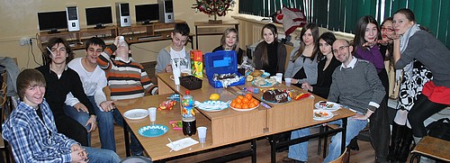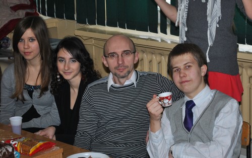 Nie ma to jak Paradoxowa wigilia, z takiego za??o??enia wyszli??my Ja, IS, ANIA D., i ANIA S. Czasu by??o ma??o bo w piÄ?tek pomys?? by og??oszony i dopiero w poniedzia??ek wszyscy zainteresowani dostali info o wtorkowej wigili. Ka??dy mia?? co?? przynie??Ä?, zadania zosta??y rozdzielone, a wiÄ?c do roboty. Anki udekorowa??y gabinet (C10) a ja czuwa??em nad sytuacjÄ?. We wtorek po wszystkiech zako??czonych jase??kach, klasowych spotkaniach itp. wszyscy zaproszeni plus osoby, kt??re siÄ? doczepi??y, wpad??y do nas. Gabrysia wraz ze mnÄ? pokierowa??a pracami remontowymi w tym wypaku oznacza??o to rozstawienie sto????w plus wszelakiego jedzenia. Przy czajniku czuwa??a Marysia i Sara. Reszta przeszkadza??a bÄ?d?? pomaga??a. Kiedy ju?? herbatka by??a zaparzona, ciasto pokrojone, a mandarynki i banany wy??o??one na talerze, mogli??my rozpoczÄ?c wigiliÄ?. Oczywi??cie po ??yczeniach jak to paradox musieli??my siÄ? sfotografowaÄ?.... i tu oczywi??cie nie by??o mowy o jednym zdjÄ?ciu, fotek powsta??a ca??a seria. Po zdjÄ?ciach zainteresowania przystÄ?pili do konsumpcji potrwa oraz s??odyczy. Wigilia przebieg??a w super atmosferze , wyg??upom i fajnym chwilom nie by??o ko??ca... DziÄ?kujÄ? od siebie Is-owi za poparcie mojego pomys??u, za czajniczek i herbatkÄ? oraz CUKIER. Asi wsp??lnie za pomoc, a reszcie za obecno??Ä? oraz "dary" na st????. Niestety Paradox w tym roku nie przygotowuje jase??ek, ale ju?? teraz zaczynamy przygotowania do PRO ARTE. Weso??ych ??wiÄ?t oraz SzczÄ???liwego Nowego Roku (proszÄ? wr??ciÄ? trze??wym do szko??y)