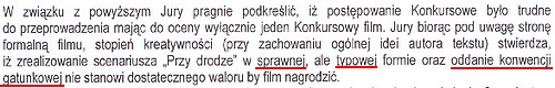 - jury proponuje nam w ramach rekompensaty publiczny pokaz filmu (film w konkursie o zerowej randze nie zdoby?? nawet wyr????nienia, ani nawet dyplomu za udzia??, wiÄ?c wstyd go w og??le pokazywaÄ?; taka propozycja jest albo g??upia albo bezczelna, ale raczej jedno i drugie)