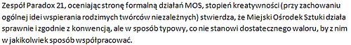 9.01.2012. Juror konkursu informuje nas, ??e postÄ?powanie konkursowe zostaje odwo??ane, poniewa?? do konkursu zosta??a dopuszczona tylko jedna praca – film zespo??u Paradox 21! Jeste??my wiÄ?c jedynym zespo??em z ca??ej Polski (konkurs by?? szeroko promowany jak zapewnia MOS), kt??ry nades??a?? pracÄ? spe??niajÄ?cÄ? kryteria jury. 12.01.2012. Do MOS trafia oficjalne pismo zespo??u Paradox 21, w kt??rym zesp???? wskazuje, ??e zgodnie z regulaminem jury nie ma podstaw do odwo??ania konkursu, domaga siÄ? przeprowadzenia konkursu i oceny filmu. Wg dyrekcji pismo to zawiera??o ??Ä?danie otrzymania g????wnej nagrody, co ??wiadczy o tym, ??e zarzÄ?dzajÄ?cy MOS nie potrafiÄ? czytaÄ? ze zrozumieniem lub po prostu lekcewa??Ä? nasze pisma (artyku?? na ten temat ukaza?? siÄ? tygodniku gorzowskim 66-400.pl) 13.01.2012. Dyrektor MOS w rozmowie telefonicznej z re??yserem filmu potwierdza, ??e rozstrzygniÄ?cie nie odbÄ?dzie siÄ?, a postÄ?powanie konkursowe wobec jednego filmu jest bezcelowe. 14.01.2012. Organizatorzy nie przeprowadzajÄ? rozstrzygniÄ?cia zaplanowanego na ten dzie??. 21.01.2012. Zesp???? na stronie internetowej MOS znajduje informacjÄ?, ??e postÄ?powanie konkursowe odby??o siÄ? (!), co potwierdza wydany z datÄ? 5 stycznia 2012 (!) protok???? jury. Jury oceniajÄ?c jedyny w konkursie film stwierdza, ??e nie zas??uguje on na ??adnÄ? nagrodÄ?. 24.01.2012. Na spotkaniu z zespo??em, organizatorzy t??umaczÄ?, ??e regulamin konkursu nie zosta?? z??amany, jury nie odwo??a??o postÄ?powania konkursowego (!), a jedynie organizacjÄ? fina??owej gali, natomiast werdykt jury wynika z oceny filmu, jest obiektywny, uczciwy i niepodwa??alny. Zesp???? Paradox 21, autor jedynej konkursowej pracy, na tym samym spotkaniu, zarzuca organizatorom nieuczciwe postÄ?powanie, z??amanie postanowie?? regulaminu, oszustwo, matactwo, arogancjÄ? i niekompetencjÄ? w ocenie.