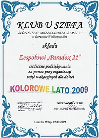 7 lipca 2009 Paradox 21 wyst?pi?? po raz pierwszy na scenie klubowej. Na zaproszenie gorzowskiego klubu "U Szefa" zagrali??my dla dzieci, kt??re w??a??nie przebywa??y tutaj na letniej kolonii... wi?c pokazali??my "Koloni? le??n?" (zagranie "Szkolnej wycieczki" okaza??o si? niemo??liwe ze wzgl?du na por? wakacyjn? i braki w materiale ludzkim). Przygotowali??my za to nasze kultowe przedstawienie z 2005 roku "Kolonia le??na" oparte na tekstach kabaretu TEY, ??wczesny pozaszkolny kabaretowy debiut. W przedstawieniu wzi?li udzia??: Karol Socha, jedyny z dawnego sk??adu, kt??ry i 4 lata temu, i teraz doskonale sprawdzi?? si? w roli Szczurka, a tak??e Gosia Kozakiewicz, ?ukasz Ch??opecki i Bartek Augustyniak. Dla tego ostatniego by?? to powr??t na scen?, pierwszy udzia?? w dzia??aniu scenicznym od s??ynnego konkursu w Zielonej G??rze w 2008 roku. Dyrekcja klubu by??a zadowolona, dzieciaki domaga??y si? autograf??w, na co August z rozbrajaj?c? szczero??ci? odpowiada??, ??e nie ma d??ugopisu. Jeszcze przed wyst?pem pojawi??o si? radio RMG, p????niej rozmawiali??my z niezale??nym dziennikarzem panem M. Kami??skim, kt??ry szykuje jaki?? du??y, tajemniczy artyku?? o Paradoxie 21. To w??a??nie on znalaz?? na youtubie materia?? o kr?conych przez P21 filmach i skontaktowa?? si? z re??yserem. Mo??na powiedzie?, ??e nawi?za?? z nami wsp????prac? i obieca?? wszelk? promocj? naszych dzia??a?? i udost?pnianie ??am prasowych, gdyby??my tego potrzebowali. By?? przede wszystkim szczerze zainteresowany nasz? tw??rczo??ci? filmow? i w tym celu na jego pro??b? do klubu specjalnie zosta??a ??ci?gni?ta gwiazda "Wyjazdu" z 2006 roku Paulina, z kt??r? chcia?? porozmawia?, a tak??e Kaja. Podzi?kowania nale??? si? ekipie, kt??ra zmobilizowa??a si? do wyst?pu, mimo wakacji i upa????w odpowiedzia??a pozytywnie na paradoxow? inicjatyw?. Dzi?ki te?? gwiazdom filmowym dawnym (Paulina) i obecnym (Kaja) za przybycie i udzia?? w wywiadzie. Otrzymali??my od razu zaproszenie na kolejne wyst?py do klubu i na kolonie prowadzone tak??e poza Gorzowem. Co z tego wyjdzie na razie jest niewiadom?. W ka??dym razie wyst?pik by?? udany i czekamy obecnie na przygotowywany du??y artyku?? o P21, kt??ry jeszcze w lipcu ukaza? si? ma w gorzowskiej prasie. W sumie ciekawe jest to, ??e dorobili??my si? ju?? przez te lata pewnego repertuaru, ??e raz grane przedstawienia nie umar??y ??mierci? naturaln? i w razie potrzeby mo??emy je wskrzesi? do ??ycia. No i ??e zesp???? ??yje, bo czemu mia??by umrze?? :P |