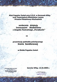 Kilka dni po premierze spektaklu historycznego w szkole, Paradox zosta?? zaproszony do klubu "Pogodna Jesie?? GDK w Gorzowie Wlkp.". W??a??ciwie zaproszenie otrzymali??my zanim przedstawienie zosta??o zrealizowane. Wyst?pili??my tam w pi?tkowy wiecz??r 13 listopada 2009 roku przy pe??nej sali, mi??o ugoszczeni, zapowiedzeni i nagrodzeni. Bywalcom klubu, kt??rzy sami pami?taj? czasy wojny, przedstawienie bardzo si? podoba??o i zesp???? zebra?? oklaski zdecydowanie wi?ksze ni?? w szkole, graj?c dla m??odzie??y. Klub przygotowa?? nag??o??nienie, wi?c z realizacj? spektklu nie by??o problemu, opr??cz tego, ??e Sendlerowa lekko nam si? sp????ni??a. Na szcz???cie przysz??a, w towarzystwie jednego z gestapowc??w (Karol). Scena by??a niewielkich rozmiar??w i a?? dziw, ??e uda??o nam si? na niej przedstawi? dynamiczn? akcj? z udzia??em kilkunastu bohater??w naraz. Na koniec by??o podzi?kowanie i... niespodzianka - dyplom dla ka??dego uczestnika, a tak??e r????e dla re??ysera Ireneusza i jego pomocnika historyczego Tomasza (panowie od razu pozbyli si? kwiat??w wr?czaj?c je aktorkom). Pojawi??a si? telewizja, nagra??a fragment przedstawienia, uci???a pogaw?dk? z re??yserem i... poszli??my co?? zje???. Wszyscy byli wi?c zadowoleni do tego stopnia, ??e zapomnieli??my zabra? z klubu nasz? dekoracj? :D Mur zosta?? na scenie.