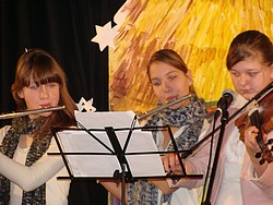 Zesp???? tworzyli: Marysia Nawrocka (wokal), Basia i Asia Kazimierczak (wokal, flet), Karolina Wronkowska (skrzypce), J?drzej Lorek (akordeon), Jacek Szmytkowski (instr. perkusyjne), Ada Lerhman (git. klasyczna) oraz pomys??odawca i inicjator tego spontanicznego pomys??u pan Ireneusz Skubicki, nauczyciel informatyki, kt??ry sam zagra?? na instr. klawiszowych i git. elektrycznej, a opr??cz tego przygotowa?? sam wszystkich aktor??w do przedstawienia jase??kowego i zorganizowa?? ??wi?teczn? kawiarenk?. Podzi?kowania nale??? si? tak??e ?ukaszowi Ch??opeckiemu z klasy IIIc, kt??ry bardzo dobrze nag??o??ni?? nasz wieloosobowy zesp???? i czuwa?? ca??y czas nad d??wi?kiem. |