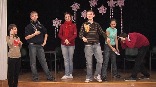 To absolutny debiut ludzi, kt??rych mo??emy nazwa? m??odymi paradoxowiczami. Opr??cz teatru by??o te?? sporo muzyki, wi?c zaprosili??my do wsp????udzia??u wielu innych ludzi. Na program "Kawiarenka ??wi?teczna" sk??ada?? si? wyst?p zespo??u wokalno-instrumentalnego oraz przedstawienie jase??kowe. Nowi ludzie zagrali s??ynne paradoxowe jase??ka z roku 2006, nosz?ce oficjalny tytu?? "Dziwne jase??ka". Na zdj?ciu wida? prawie 20 os??b zaanga??owanych w t? ??wi?teczn? akcj?. Ca??y program trwa?? jedn? godzin? lekcyjn?. Grali??my go 6 razy, 5 razy dla uczni??w szko??y, przede wszystkim dla szko??y podstawowej (19 i 20 grudnia 2007), jeden raz na specjalnym pokazie dla rodzic??w i nauczycieli (19 grudnia o godzinie 17.00 i to by??a w??a??nie prawdziwa kawiarenka ??wi?teczna).