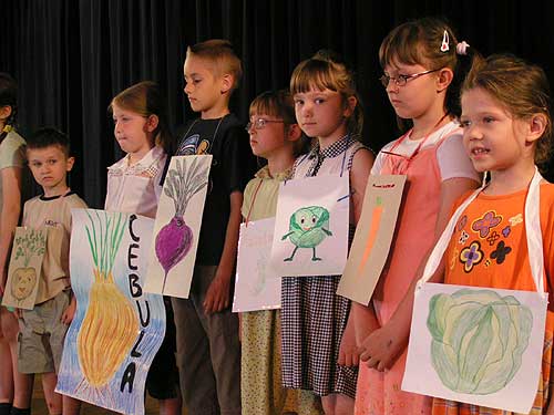 Uczniowie klasy I A po raz pierwszy na scenie. Prezentowali wiersze Jana Brzechwy.