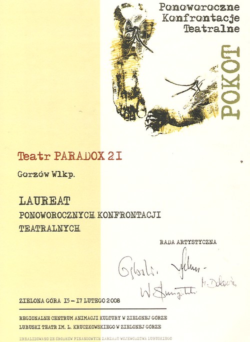 Uk??ony dla publiczno??ci, uk??ony dla Paradoxu 21, kt??ry nie tylko istnieje, nie tylko si? bawi, ale te?? okaza?? si? czarnym koniem drugiej edycji Ponoworocznych Konfrontacji Teatralnych w Zielonej G??rze. Zostali??my laureatem i cieszy nas to podw??jnie, a nawet potr??jnie - po pierwsze by?? to nasz debiut na scenie teatru nazwijmy to doros??ego (dla m??odzie??y od 16 lat w g??r?), po drugie zagrali??my naprawd? ??wietnie i chocia?? byli??my chyba najm??odsi, stan?li??my do r??wnej rywalizacji z zespo??ami, kt??re s? ju?? wyjadaczami amatorskiej sceny teatralnej i wielokrotnie w Zielonej G??rze wyst?powa??y, po trzecie po???czyli??my sukces ze ??wietn? zabaw?. Wielki szacunek dla ludzi, kt??rzy stworzyli razem kawa??ek energetycznego teatru, bo chocia?? nasi aktorzy rozeszli si? po r????nych szko??ach i maj? nowe obowi?zki, to udowodnili prawd?, ??e "chcie? to m??c".