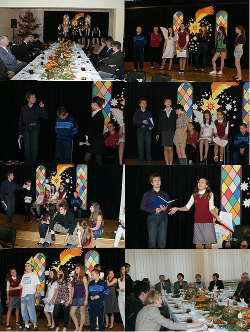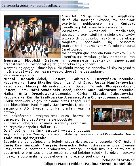 Mix zdjÄ?Ä? z "Bardzo prawdziwych jase??ek". Przedstawienie zaprezentowane 18 grudnia 2008 roku obejrza??o zaproszone przez naszÄ? paniÄ? dyrektor liczne grono dyrektor??w gorzowskich szk????, a tak??e reprezentanci w??adz miejskich i o??wiatowych. Nasza scenka to z??o??ony program artystyczny. Wszystko zaczyna siÄ? od wystÄ?pu czwartoklasistek, kt??re ??piewajÄ? na ??ywo "ChoinkÄ?". Do tego debiutu przygotowa??a je pani Magda Jankowska. Potem nastÄ?puje zasadnicza czÄ???Ä? naszych jase??ek wymy??lona i re??yserowana przez pana Skubickiego, przeplatana wystÄ?pami szkolnego zespo??u OK, kt??rym oczywi??cie dyryguje r??wnie?? pani Magda. Dziewczyny z OK nie tylko ??piewajÄ?, stanowiÄ? czÄ???Ä? przedstawienia.