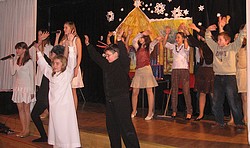 To absolutny debiut ludzi, kt??rych mo??emy nazwa? m??odymi paradoxowiczami. Opr??cz teatru by??o te?? sporo muzyki, wi?c zaprosili??my do wsp????udzia??u wielu innych ludzi. Na program "Kawiarenka ??wi?teczna" sk??ada?? si? wyst?p zespo??u wokalno-instrumentalnego oraz przedstawienie jase??kowe. Nowi ludzie zagrali s??ynne paradoxowe jase??ka z roku 2006, nosz?ce oficjalny tytu?? "Dziwne jase??ka". Na zdj?ciu wida? prawie 20 os??b zaanga??owanych w t? ??wi?teczn? akcj?. Ca??y program trwa?? jedn? godzin? lekcyjn?. Grali??my go 6 razy, 5 razy dla uczni??w szko??y, przede wszystkim dla szko??y podstawowej (19 i 20 grudnia 2007), jeden raz na specjalnym pokazie dla rodzic??w i nauczycieli (19 grudnia o godzinie 17.00 i to by??a w??a??nie prawdziwa kawiarenka ??wi?teczna).