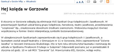 ??eby nikt nie m??wi??, ??e ma??o news??w albo ??e nic siÄ? nie dzieje. Evan vel Grygu?? zaglÄ?da na naszÄ? stronÄ? o dziwo co jaki?? czas. Wie zapewne, ??e dostali??my siÄ? na fina?? wojew??dzki do SulÄ?cina i jakby chcia?? mo??e z nami pojechaÄ? w charakterze widza :) Niech jednak lepiej siÄ? uczy na Rondzie, bo jedziemy w dniu szkolnym. No fakt, SulÄ?cin czeka na nas. Ju?? wiadomo, ??e zaprezentujemy siÄ? jako jeden z 17 zespo????w ze wszystkich powiat??w wojew??dztwa lubuskiego. Wiadomo tak??e, ??e mamy du??e apetyty na jaki?? sukces i jest szansa, ??eby co?? wygraÄ?, ale oczywi??cie konkurencja nie ??pi i inni te?? tego chcÄ?. SulÄ?cin to nasze miejsce sukcesu i dobrze by??oby go powt??rzyÄ?. W tym roku lekka zmy??ka, bo wystÄ?pujemy jako Gimnazjum nr 21 (a nie 11), bo od wrze??nia zmieni??a siÄ? numeracja. Ale najwa??niejsze, ??e w finale wojew??dzkim po raz pierwszy zaprezentuje siÄ? P a r a d o x 2 1. Mo??e byÄ? ciekawie, ale najwa??niejsze jest chyba prze??ycie ciekawej przygody, ni?? sama wygrana. No nie wiem. |